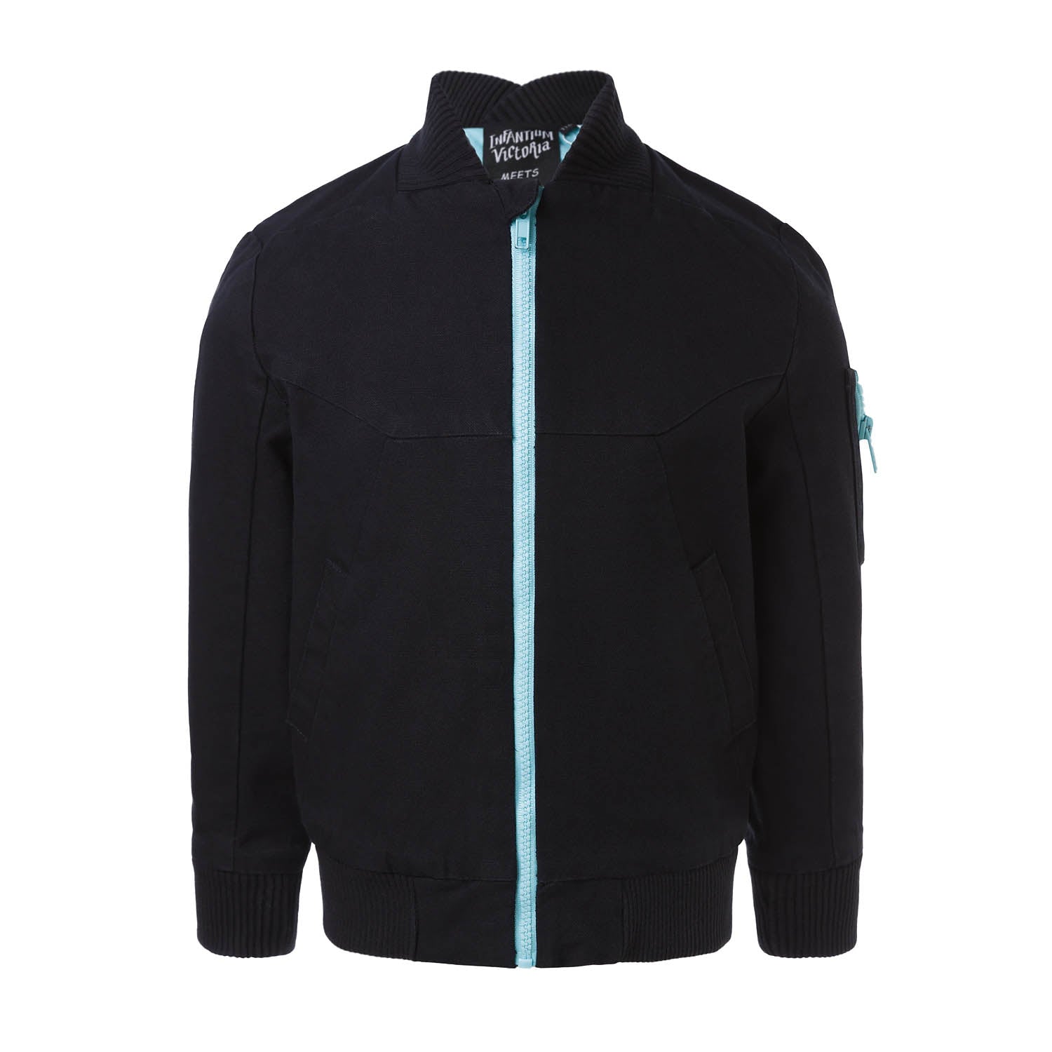 Classic Black Bomber Jacket made from organic cotton canvas with soft light blue lining and zipper and beautiful floral embroidery on the back. Ribbed stand-up collar, flap side pockets with a press-stud, a zipped pocket on one sleeve, and ribbing at the cuffs and hem.